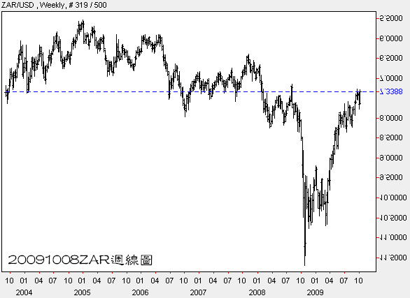 第二張是USD/ZAR的週線圖,我把中間的圖垂直翻轉過來了,所以圖的意義是ZAR/USD,時間座標X軸已經同步,可以直接上下兩張對照看