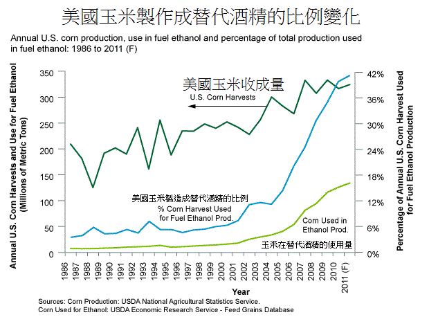 從下圖可以看到玉米做為替代能源的比例越來越高,2011年預估可以達到42%,美國玉米耕地面積從1960年80百萬英畝與2010年90百萬英畝,玉米產量增加2.4倍來看,美國這些年來增加的玉米產量幾乎都拿去製作成替代酒精了