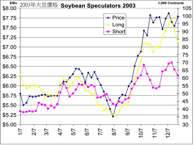 中國當地的油脂壓榨工廠嚇個半死,該月份4月份以平均至少US$9.25/BU的價格搶進了800多萬噸大豆,5月份大豆漲到US$10.25/BU,6月份華爾街的炒家在芝加哥期貨交易所開始拋售大豆期貨,當時中國許多日照壓榨工廠才剛剛建好,在US$9.25/BU的時候從美國進口了許多大豆,船還沒有靠岸就跌到US$8.25/BU以下,三個月內剩下US$5.75/BU,工廠還沒有開工就倒了一半!最後70%的中國油脂壓榨工廠全線倒閉。