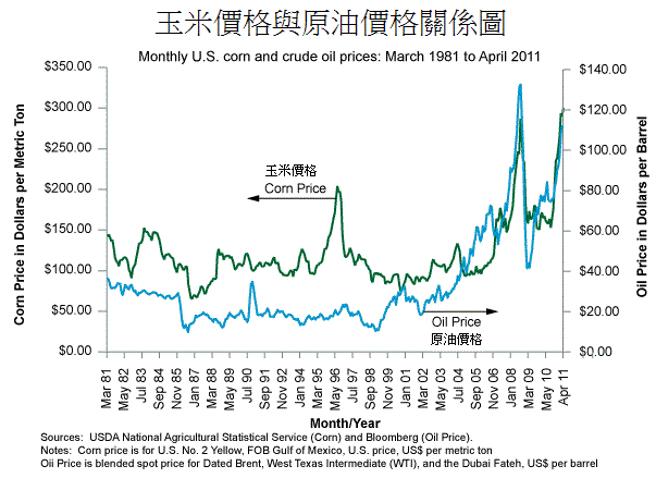 這個故事要從玉米說起,當1970年代,玉米和甘蔗研發成替代酒精技術陸續提高效率以來,玉米的價格就水漲船高(本文中農作物若無另外說明皆以美國產地為主),從下圖可以看到2000年以後,玉米的漲勢隨著原油上漲連動的規律性極高,震度幅度甚至高於原油