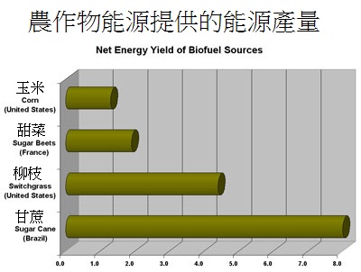 為了能找到取代原油價格高漲的方法,世界各國持續研發能替代能源的農作物,包含玉米、甘蔗、大麥、小麥、燕麥、稻米等穀類,還有甜菜、甜高粱、木薯、甘藷等,截至目前為止,能源轉換效率較好的剩玉米、甜菜、甘蔗、柳枝,溫帶地區的美國以種植玉米為主,雖然柳枝的能源轉換效 率更高,但玉米更普遍,而且周邊效益的價值更高,油價低時還可以恢復成原本的飼料或食物功能,歐洲是溫帶地區,以種植甜菜為主,最理想的是巴西,位於熱帶地區的區域最廣,可以種植大量的甘蔗