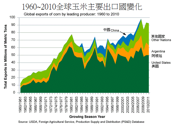 從下圖可以看到玉米做為替代能源的比例越來越高,2011年預估可以達到42%,美國玉米耕地面積從1960年80百萬英畝與2010年90百萬英畝,玉米產量增加2.4倍來看,美國這些年來增加的玉米產量幾乎都拿去製作成替代酒精了