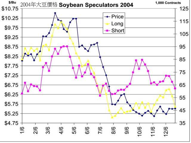 中國當地的油脂壓榨工廠嚇個半死,該月份4月份以平均至少US$9.25/BU的價格搶進了800多萬噸大豆,5月份大豆漲到US$10.25/BU,6月份華爾街的炒家在芝加哥期貨交易所開始拋售大豆期貨,當時中國許多日照壓榨工廠才剛剛建好,在US$9.25/BU的時候從美國進口了許多大豆,船還沒有靠岸就跌到US$8.25/BU以下,三個月內剩下US$5.75/BU,工廠還沒有開工就倒了一半!最後70%的中國油脂壓榨工廠全線倒閉。