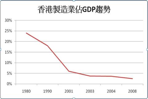 香港本身幾乎沒有天然資源,在人口紅利上升期間,將比例最大的紡織和成衣製造業移出到鄰近的中國,只留下高科技和技術相關的機器和設備業、電子業、印刷和出版業、食品製造業及金屬製品業,搭配零售、批發、金融、旅遊、運輸等服務業,直到美國的經濟恢復和中國的經濟崛起,帶動整個消費與貿易市場,香港經濟逐漸持續榮景