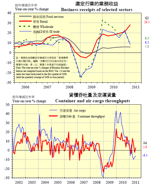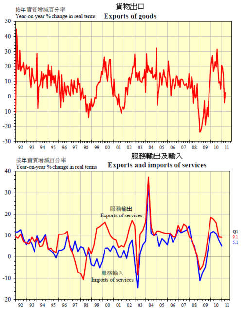 、貿易出口效率(進出口貿易和批發業收益出現反向大幅走跌)或是出口值來看,香港都面臨整個對外出口業無法拉抬的情況,一方面是中國本身港口的重要性越來越高,逐漸分散香港的重要性,二來是香港美國的貿易比例高,美國的經濟成長緩慢確實對香港造成極大的影響