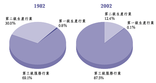 香港本身幾乎沒有天然資源,在人口紅利上升期間,將比例最大的紡織和成衣製造業移出到鄰近的中國,只留下高科技和技術相關的機器和設備業、電子業、印刷和出版業、食品製造業及金屬製品業,搭配零售、批發、金融、旅遊、運輸等服務業,直到美國的經濟恢復和中國的經濟崛起,帶動整個消費與貿易市場,香港經濟逐漸持續榮景