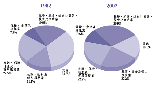 1980年美國通貨膨脹高漲迫使美元利率維持在12~20%之間,直到1983年美國才壓制下通貨膨脹,恢復經濟成長,這段期間香港將製造業的經濟結構轉型,避免受制於單一型態出口的風險,逐漸轉換成服務業的發展型態,提高內需市場的比例