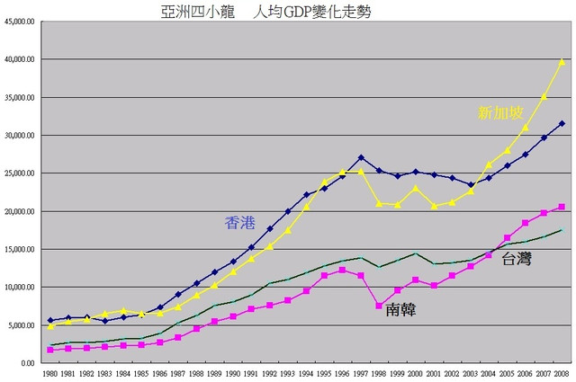 1989年中國六四天安門事件,1997年香港爆發禽流感,接著回歸中國,正式結束英國156年的殖民統治1997年以前香港就陸續出現移民潮,香港人刻意避開中國政府的政治侵入,移往新加坡和加拿大等地,香港內部經濟開始出現變化1997年8月索羅斯趁機引爆亞洲金融風暴從人均GDP變化可以看到1997~2003是香港經濟倒退的時期,香港的房地產業和金融貿易全面受損,直到2003年美國經濟從網路泡沫中再度復甦,香港經濟才又恢復到1997年以前的水準