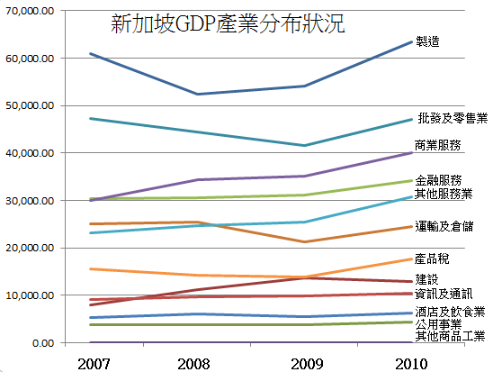 相對較安定的政治問題和國家企業化經營新加坡1960年代建設裕廊工業區(Jurong Industrial Park),發展勞動密集型工業,逐漸過渡到高附加價值的資本、技術密集型工業和高科技產業,新加坡政府明白僅僅依靠轉口貿易維持生計不是長久之計,陸續興建樟宜機場1984年亞洲第一家金融期貨交易所新加坡國際金融交易所(Singapore International Monetary Exchange Ltd,SIMEX)、運輸中心國際貿易中轉站電子產品製造中心和煉油廠,最後才演變成現在的資訊產業和知識密集型經濟,從GDP產業分布可以看到,新加坡的經濟發展是屬於製造業和商業服務業的並行模式