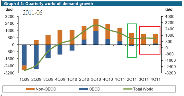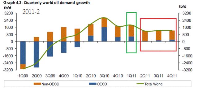 2011年6月,全球用油需求2011年Q1意外比2010年Q4少,但OPEC預估2011年Q2~Q4用油需求成長會維持恆定