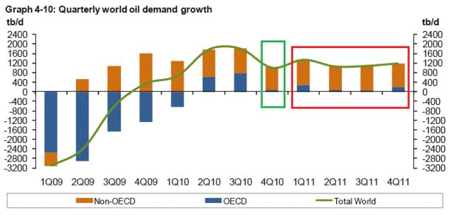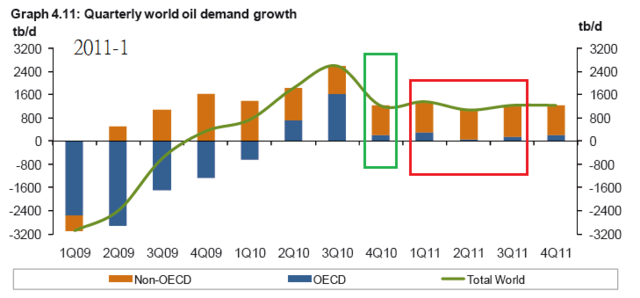 2011年1月,結果全球2010年Q3實際需求用油量意外大幅成長,OPEC預期2011年原油需求會增加