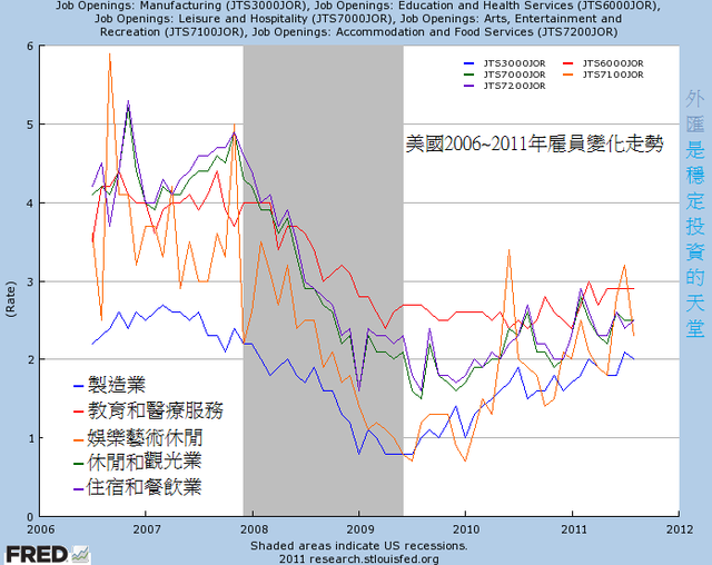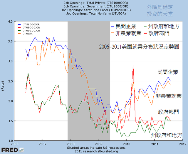 ,為何2010年下半年以後失業率持續高檔,無法有效拉下來,關鍵就在於政府部門的工作機會大幅減少,從下圖可以看到,由政府部門所提供的工作機會,在2008年次級房貸的臨時機制下退場,大量的失業人口提高了美國的失業率,如何消化失業人口,是長期抗戰,美國政府正在引導人民往民間就業,尤其是非農業就業,這樣才能提升內需市場為主的服務業,美國政府正在從釋放出的工作職缺引導人民回到適當的工作岡位上