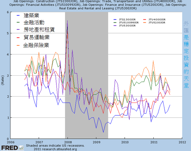,為何2010年下半年以後失業率持續高檔,無法有效拉下來,關鍵就在於政府部門的工作機會大幅減少,從下圖可以看到,由政府部門所提供的工作機會,在2008年次級房貸的臨時機制下退場,大量的失業人口提高了美國的失業率,如何消化失業人口,是長期抗戰,美國政府正在引導人民往民間就業,尤其是非農業就業,這樣才能提升內需市場為主的服務業,美國政府正在從釋放出的工作職缺引導人民回到適當的工作岡位上