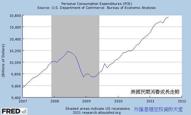2.美國進口的商品,如果扣除原油,幾乎是非常緩和在成長,美國人經濟拮据所以不買商品,不消費嗎,來看下圖美國民間消費成長,已經超過了2008次級房貸的總值,美國人不是不消費,而是逐漸轉為購買美國國內的產品,降低進口的使用量