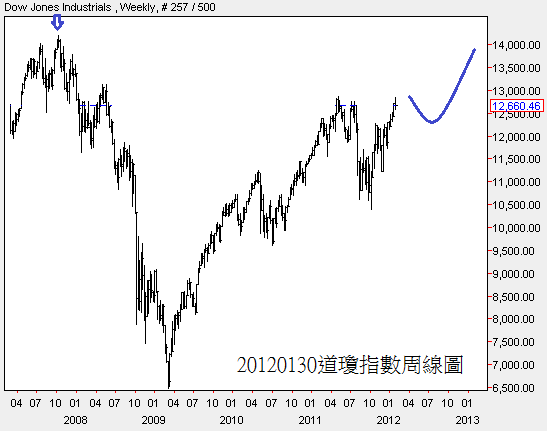 美國2011年Q4 GDP仍然沒有出現3%以上的成長力,理論上再度出現3%以上的經濟成長得等到2012年Q3以後,道瓊指數2012年有機會挑戰2007年底的歷史高點