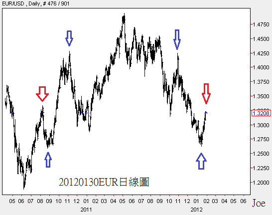 EUR維持了近20個月的類似對稱走勢,等價格突破2010年8月紅色箭頭的走勢以後,再來判斷2012年EUR的趨勢會有何改變(20120130 09:45修正)