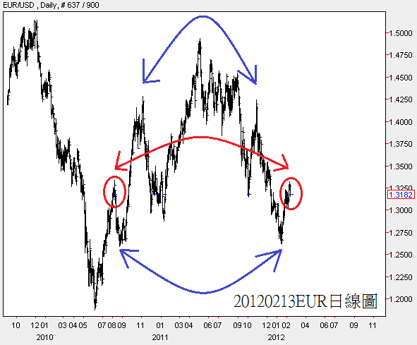 | EUR | ![]() 線圖呈現左右對稱的局勢較明顯,第一季內仍然是觀察EUR是否會形成日線圖上的下跌走勢,EUR適合觀察但不適合直接操作 |