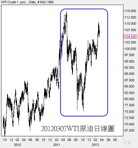 | WTI原油 | ![]() 圖形相當漂亮喔,這波原油幾乎沒有回檔,所以第二季末通貨膨脹會再起來喔,3~5月會是通貨膨脹較緩和的時候,也是QE3高機率實施的機會,耐心等待FED的利率會議 |