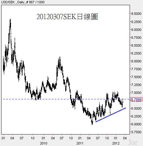 | SEK | ![]() SEK趨勢已經轉為不利,甚至影響到SEK日線圖以上的走勢,SEK高點恐怕已過,2012年市長線的起跌點,可以趁QE3推出以前自行做減量調整 |