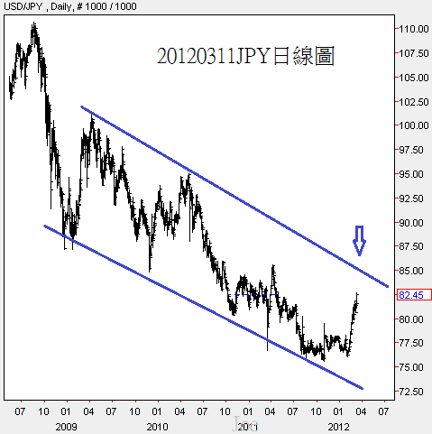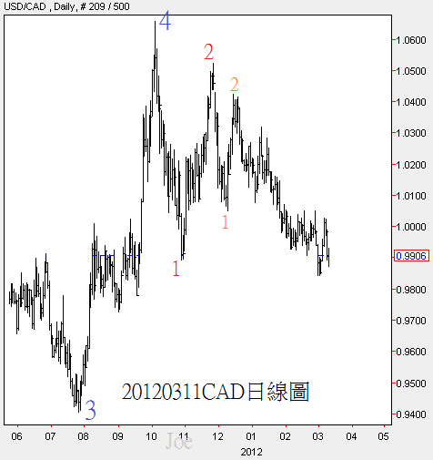 價格突破2011年10月底的波段低點,USD/CAD的型態進入空頭的走勢了,今年內CAD的匯率還有再走升突破0.940的空間