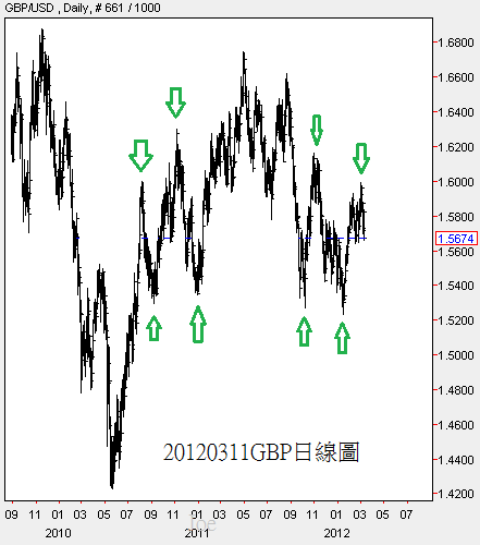 綠色箭頭出現的部分,讓GBP線圖呈現較為對稱的走勢,這對GBP是非常不利的發展,GBP在未來兩年內會有頗大的貶值空間