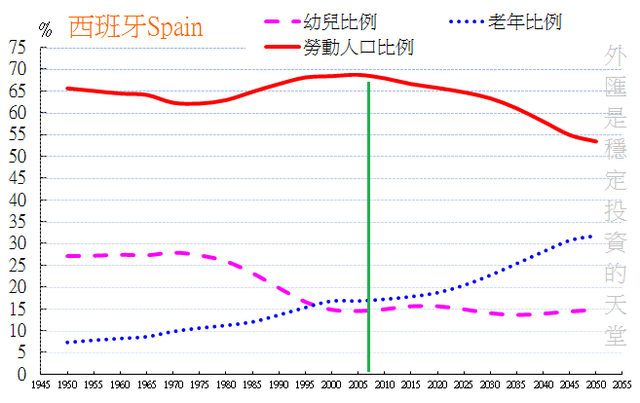 2006~2008年是西班牙經濟開始走向衰退的開始,剛好跟人口結構巔峰不謀而合1990年日本、2008年美國和俄羅斯、2010年英國和歐洲,除了美國以外,已開發先進國家先後在短時間內進入了房地產崩盤和經濟大蕭條,共同因素都是人口負債結構,三年內,台灣、韓國、中國,要邁入歷史上第一次的人口負債結構,你準備好了嗎!