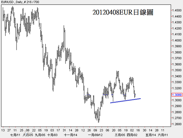 我看法不變,我依然認為第二季中以後才會出現最糟糕的氣氛,然後聯準會實行新的貨幣政策,不管是QE3還是OT3或是新玩法,理想的話會拉出一波多頭,目前仍然繼續等待,賺短線的震盪價差,運氣成分太高,不適合大眾玩