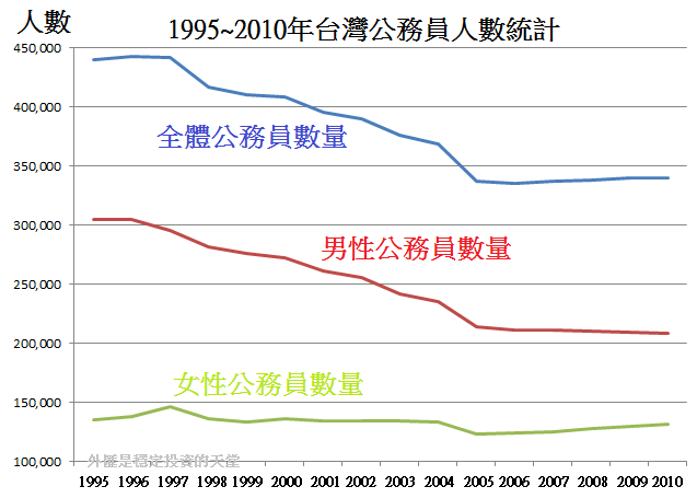 皮公營的骨,如果扣除並修正這種類似的現象,其實公務員從1995–>2010年根本沒有明顯的減少…..