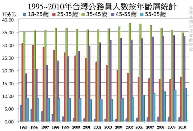 影響最長遠的則是公務人員的年齡層分布,可以從圖中看到,台灣公務人員主要集中在35~45歲,目前正在往45~55歲移動,假設公務人員65歲退休,那麼台灣基層的公務人員,未來20年內,2032年以前,上層的管理職缺增加速度將遠少於下層新進人員的速度,導致公務人員的晉升制度難以維持,如果為了全面提升職務等級和薪資獎勵,那麼退撫卹的總支出將增加擴大速度
