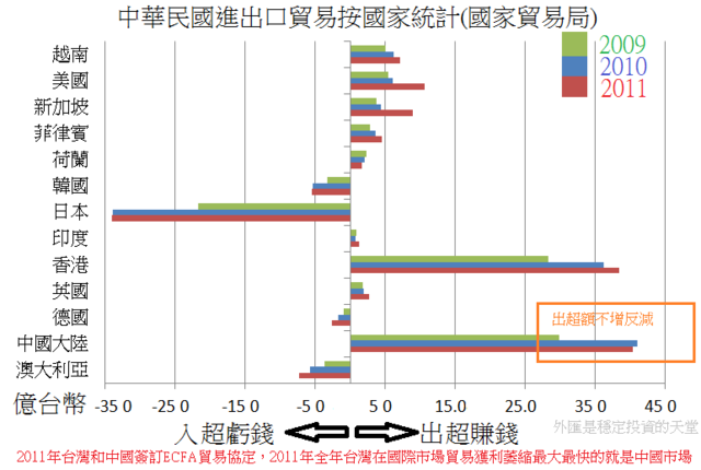 2009~2010年,大陸和香港都是同時增加的,2011年台灣和香港無簽訂貿易新合約,出超持續增加,2010年以前和中國沒有簽ECFA,出超也是比前一年高,2011年一簽,出超立刻縮水