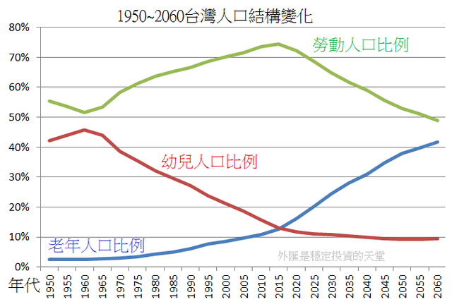 2000年代,世界上許多新興市場,例如越南、中國、印尼、巴西,也逐漸邁入人口勞動力上升的階段,台灣勞動力的增加速度逐漸超過勞動職缺增加速度,雖然收入依然是增加的,但收入成長率已經開始下滑,而當年的嬰兒潮世代,已經35~55歲,逐漸邁入各產業的管理階層,收入提升,擴大購置房地產和擴張企業發展,2010年代,嬰兒潮世代逐漸邁入了各產業的階級最頂層,他們幾乎掌管了台灣各個經濟領域的最大指揮權,2020年代,嬰兒潮世代即將退休了,而且往後每個年齡層的人口越來越少,未來台灣將逐漸面臨退休金不足的困境