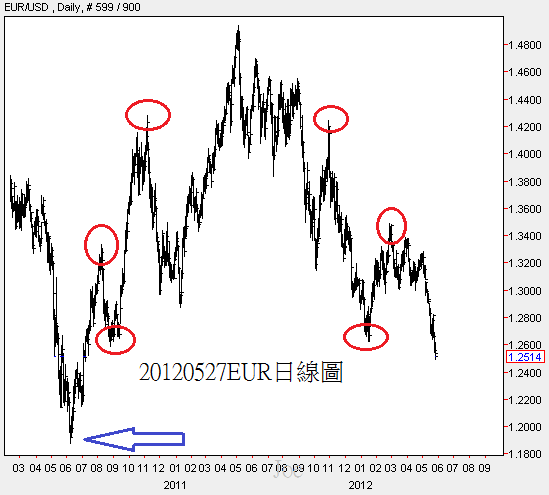 | EUR | ![]() 紅色圈圈都已經陸續到位,2013年第一季以前,歐元的目標預估是藍色箭頭的價位,歐元長線不適合做多操作 |