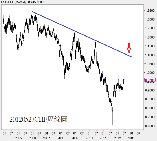 | CHF | ![]() 短線貶值目標大約在紅色箭頭位置,貶值對於瑞士的產業發展是比較理想的,不過EUR/CHF依然鎖在1.200,對於和歐盟貿易密切的瑞士來說,貨幣貶值對出口效益還是無法完全展開 |