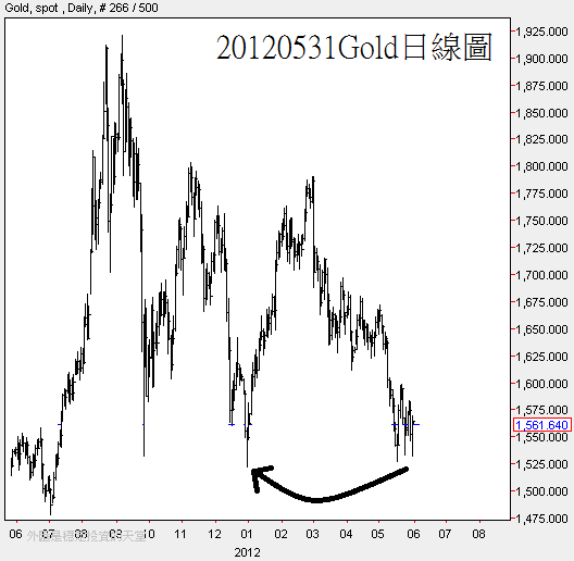 20120531Gold分析 2012-05-31 joe 每周財經評論(Investment opinion) 0 黃金經過了一個晚上,仍然未脫離危險期,如果跌破黑色箭頭處的低點,那麼就會再引發一波新的下跌衍生浪,聯準會的動態是決定黃金走勢的關鍵 沒有改變看多黃金的看法,但在轉多頭以前,得苦撐一段時間就是了