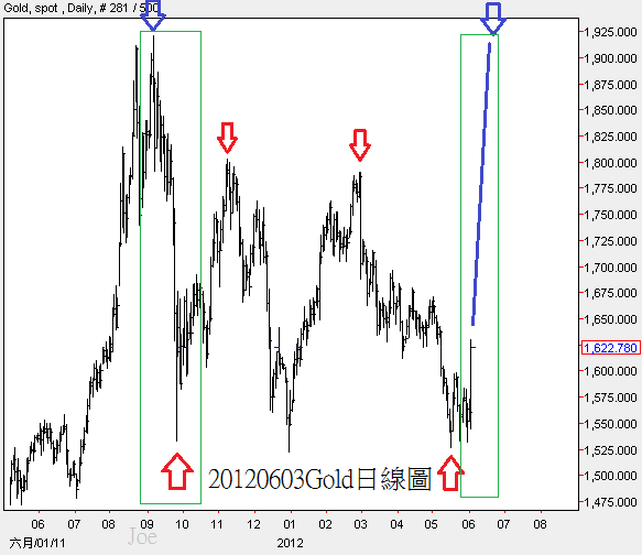 | 黃金 | ![]() 前一週才說明Gold不盡快拉回US$1625以上的話,對整個型態是不利的,6月1號Gold就硬是反彈到整個型態的理想位置,紅色箭頭全部到位,接下來等待藍色箭頭,2011年,Gold下殺時,只在綠色框框內,極短的一個月內完成,如今反彈趨勢裡,理論上也會快速反彈到約略等高的位置,耐心看著吧,賭賭看了 |