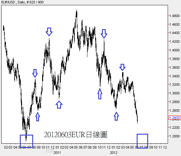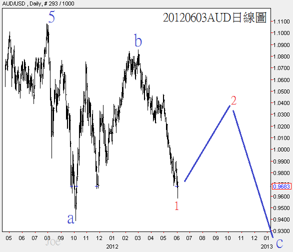 | AUD | ![]() 6月1號已經跌破2011年11月的最低價位,就算有QE3,長線也只能形成反彈格局,這是不利的線圖型態,第四季以前若有出現紅色2的價位,恐怕就得分散出場,但眼下還不用過度驚慌,聯準會第三季會壓下強勢美元,原物料貨幣會再出現反彈走勢 |