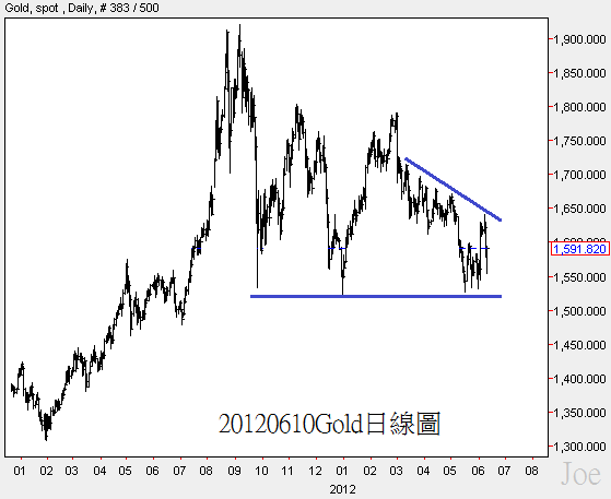 雖然Gold拉回US$1625以上,但是碰到藍色壓力線時,又出現暴跌,整體轉為對整個型態是不利的,如果Gold在聯準會會議過後,依然無法突破藍色線之間的盤整區域,那麼下跌的走勢就會出現,操作貴金屬務必做好籌碼控管