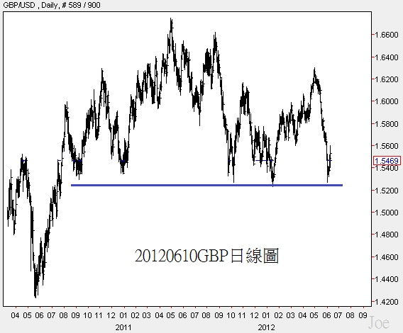 目前GBP仍然維持在2010年以來,所產生的支撐線上,只好這個月能持續維持在這條線上,那麼跌破這條線理論上是2012年12月以後的事了,暫時可以在第三季出現反彈