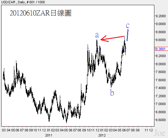 價格漲破a浪以後,短線理論上還得繼續完成c浪,但是ZAR的波浪向來都很拖時間,耐心等等,目前還無法判斷短期動向