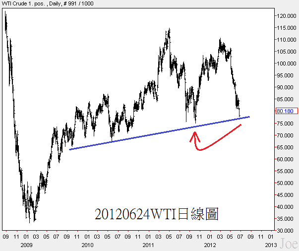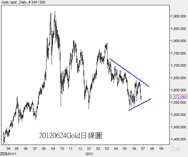 | 黃金 | ![]() 雖然上周美國聯準會沒有宣布推出QE3,黃金利多出盡,但只有逐漸縮小盤整區間,沒有出現7%以上的大跌走勢,不過頭肩底型態已經被破壞,目前只能等新的形態出現才能判斷黃金下半年的發展,暫時得等到7月底 |