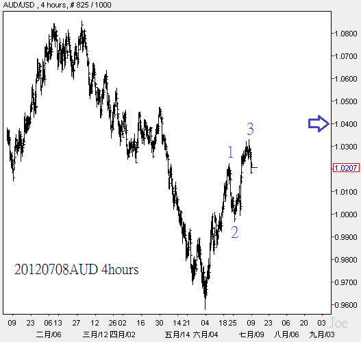 AUD出現3浪的線圖結構,US$1.04依然是下半年的目標價位,短線上漲多回檔調整是正常現象