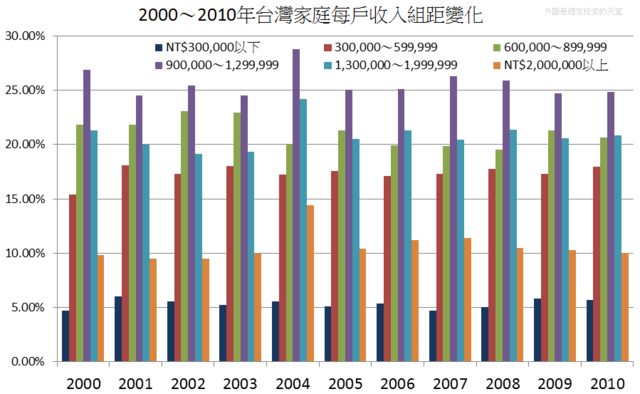 2000~2010年之間,2002年是台灣人相對窮困的年代,然後大部分家庭逐漸變的富裕,台灣人民最均富是時期是2006和2007年,台灣人在2007年又比2006年更富有2007年年收入低於30萬的家庭比例和2000年幾乎都是4.7%,近10年來最低