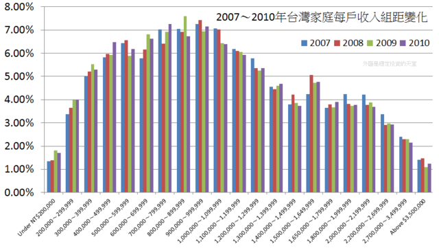 2000~2010年之間,2002年是台灣人相對窮困的年代,然後大部分家庭逐漸變的富裕,台灣人民最均富是時期是2006和2007年,台灣人在2007年又比2006年更富有2007年年收入低於30萬的家庭比例和2000年幾乎都是4.7%,近10年來最低