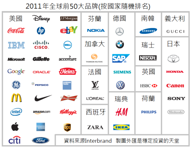 經過10年洗禮,這是2011年的全球前50名的大企業,其中美國佔了28家,其他國家佔了22家,近十年來依然屹立在全球前50名的企業,已經成為名副其實的優良品牌,但商業的競爭沒有一刻可以休息,否則隨時會被踢出名單外