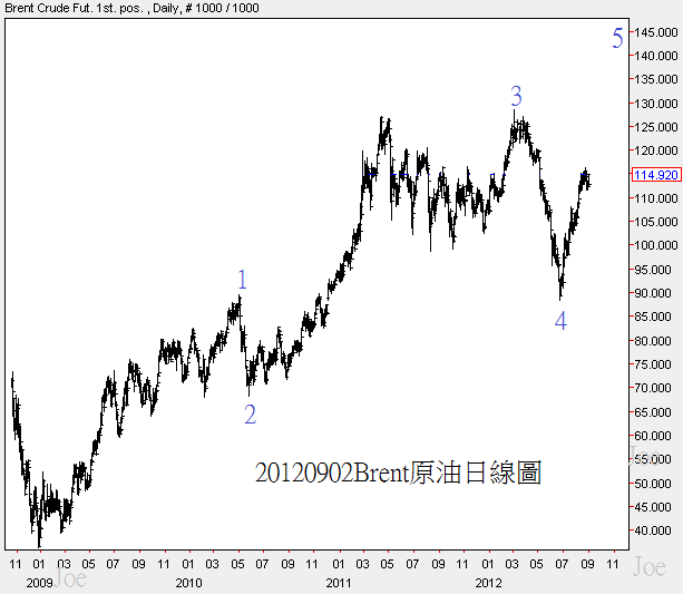| Brent原油 | ![]() 年底前免不了一場快速上漲的通貨膨脹,這是泡沫崩盤前的第五浪,也是2009~2012年炒作的一個完成階段,11月以後,就要隨時留意趨勢的反轉了 |