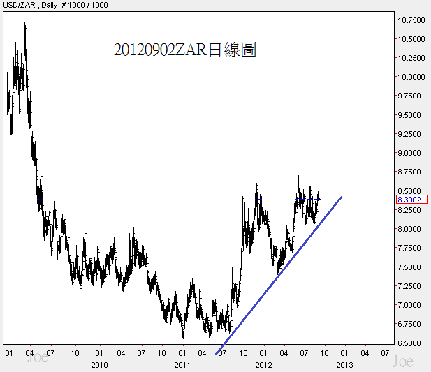 | ZAR | ![]() 8月中曾說過,ZAR有高機率會提前反應2013前的經濟蕭條,線圖上已不適合持有太高比例,目前的線圖反應來看,ZAR的投資風險越來越高了,要扭轉日線圖的頹勢,最快恐怕得等2013年下半年了 |