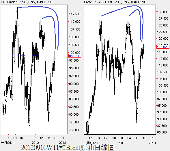 不管是WTI還是Brent原油,前者接近US$100,後者接近US$117,2009年以來的大規模回檔都出現在這個波段價位之上,由於原油期貨價格上漲到生活商品價格上漲會有時間延滯性,美國大選前,通貨膨脹會逐漸浮現