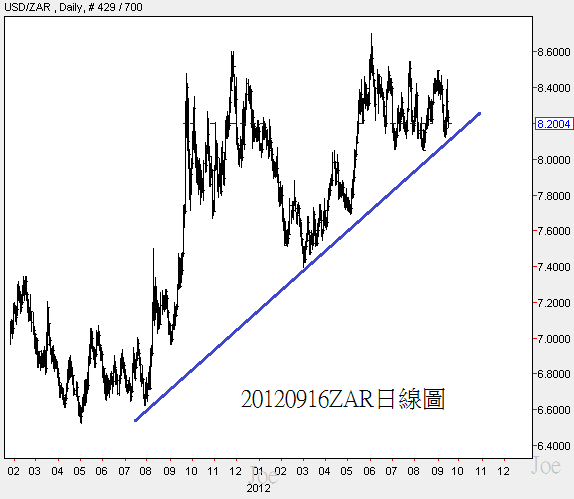 USD/ZAR仍然無法跌破斜支撐線,堪稱是最弱勢的非美元貨幣,如先前所評估,ZAR到2013年第一季恐怕都會維持弱勢,提前反應美國大選後的經濟走向