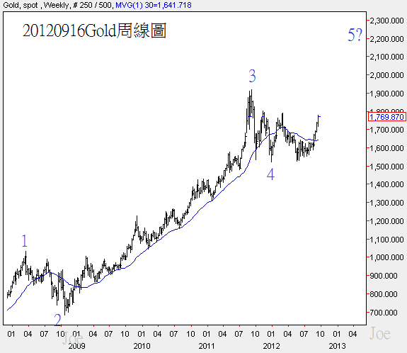 QE3已經順利出線,Gold最快年底前還有機會再上攻US$1900的價位,而周線Gold的漲勢可能繼續延遲到2013年下半年,甚至更長的時間