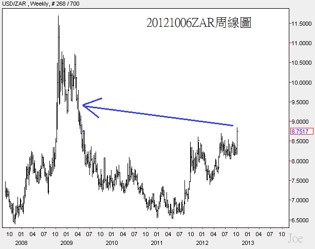 ZAR已經在反應2013年第一季的空頭走勢,ZAR得守住藍色箭頭的價位,穩住月線圖C浪的升值模式,否則對未來5季會是劣勢的局面